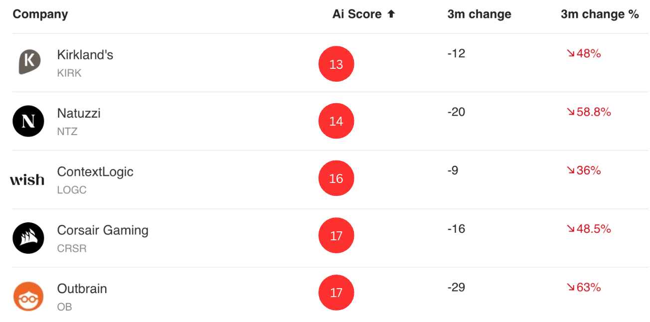 This is always a sad section (or an exciting one if you’re bearish and love to short things), but here are the worst-rated stocks on all of AltIndex: