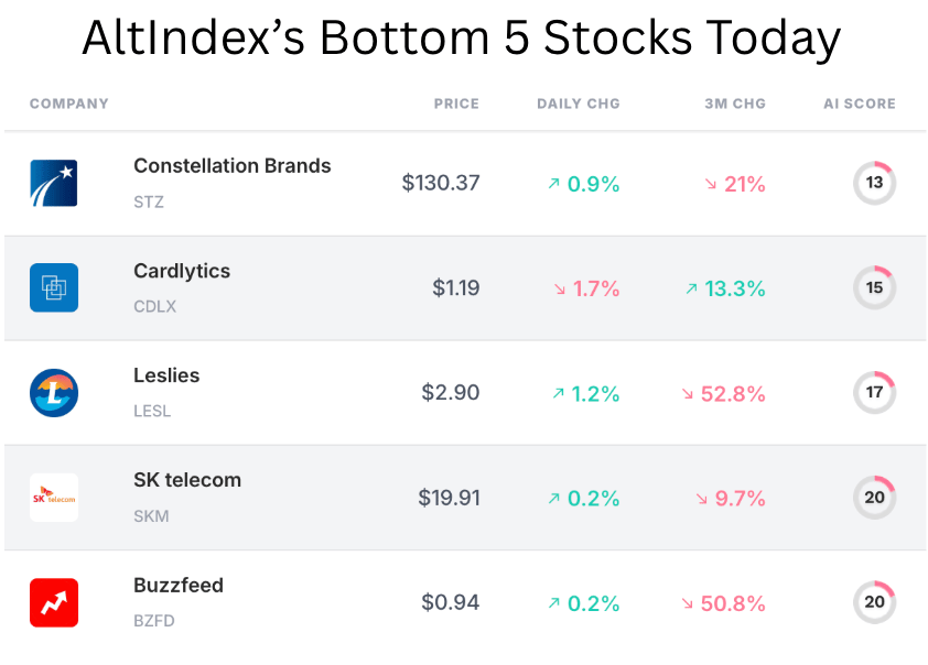 These are the five worst-rated stocks on our platform. Our AI model sees these as strong sell signals. Always do your own research.
