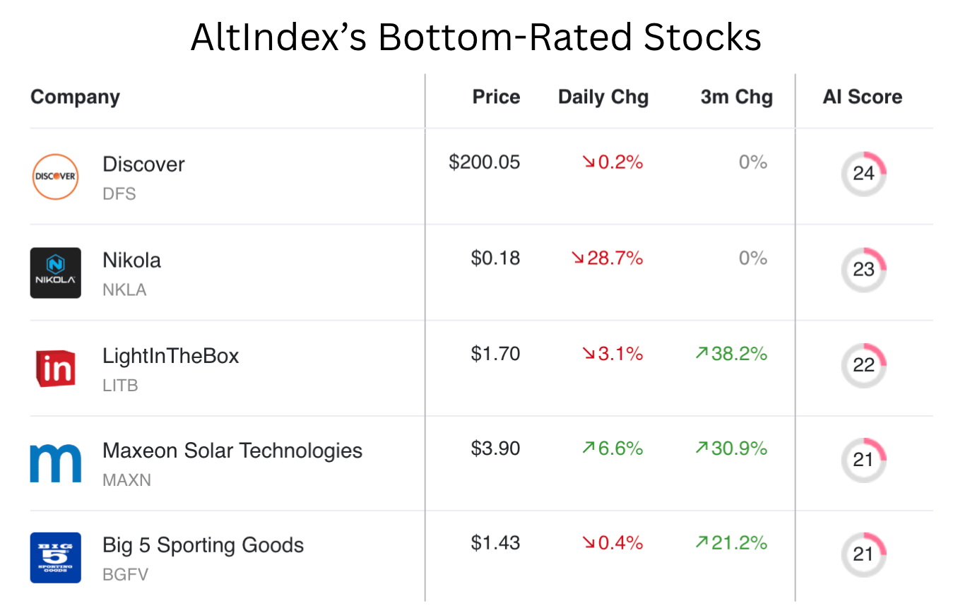 These are the five worst-rated stocks on our platform. Our AI model sees these as strong sell signals. Always do your own research.