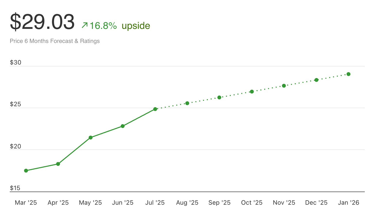 Current price: $24.77 (+3.38% MoM, +78.97% YoY) — strong long-term uptrend.