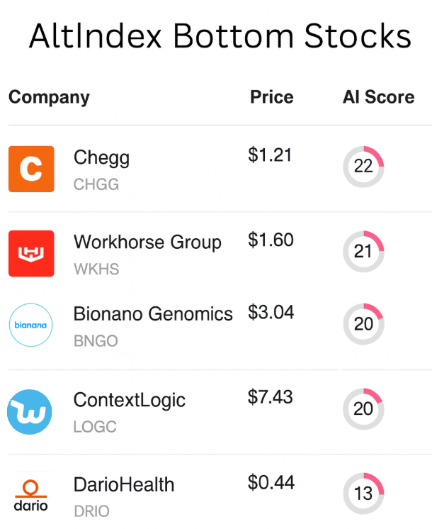 The stock picks and rankings provided by AltIndex are designed solely for informational use. They are not to be taken as investment guidance or a suggestion to purchase or sell any form of security. These rankings are the outcome of smart algoritms that are estimating future performance based on fundamental and alternative data analysis. We strongly advise that before you make any investment choices, you should thoroughly consider a variety of information sources and consult with a qualified financial advisor. It's important to remember that all investment activities come with inherent risks, and the historical performance does not assure future results or returns.