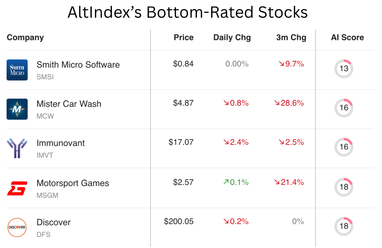 These are the five worst-rated stocks on our platform. Our AI model sees these as strong sell signals. Always do your own research.