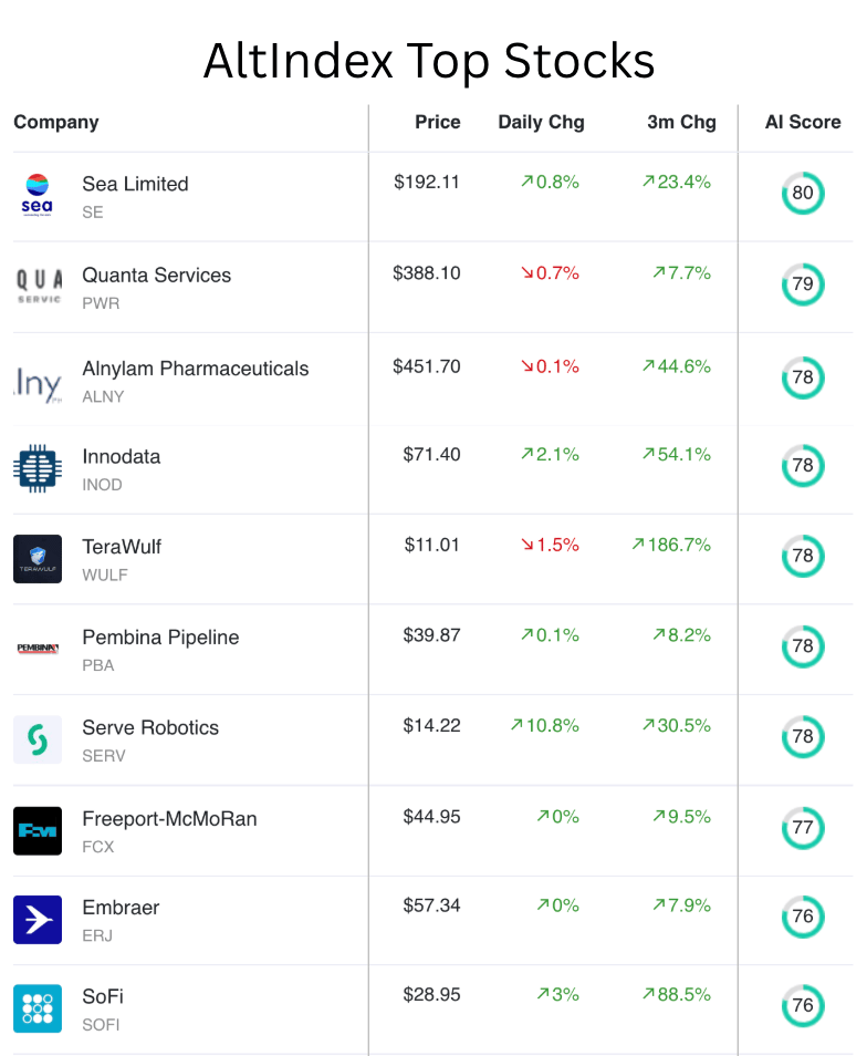 The stock picks and rankings provided by AltIndex are designed solely for informational use. They are not to be taken as investment guidance or a suggestion to purchase or sell any form of security. These rankings are the outcome of smart algoritms that are estimating future performance based on fundamental and alternative data analysis. We strongly advise that before you make any investment choices, you should thoroughly consider a variety of information sources and consult with a qualified financial advisor. It's important to remember that all investment activities come with inherent risks, and the historical performance does not assure future results or returns.