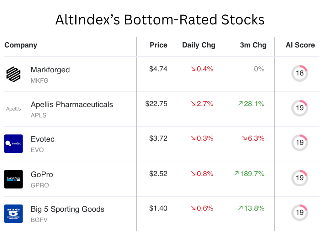 These are the five worst-rated stocks on our platform. Our AI model sees these as strong sell signals. Always do your own research.